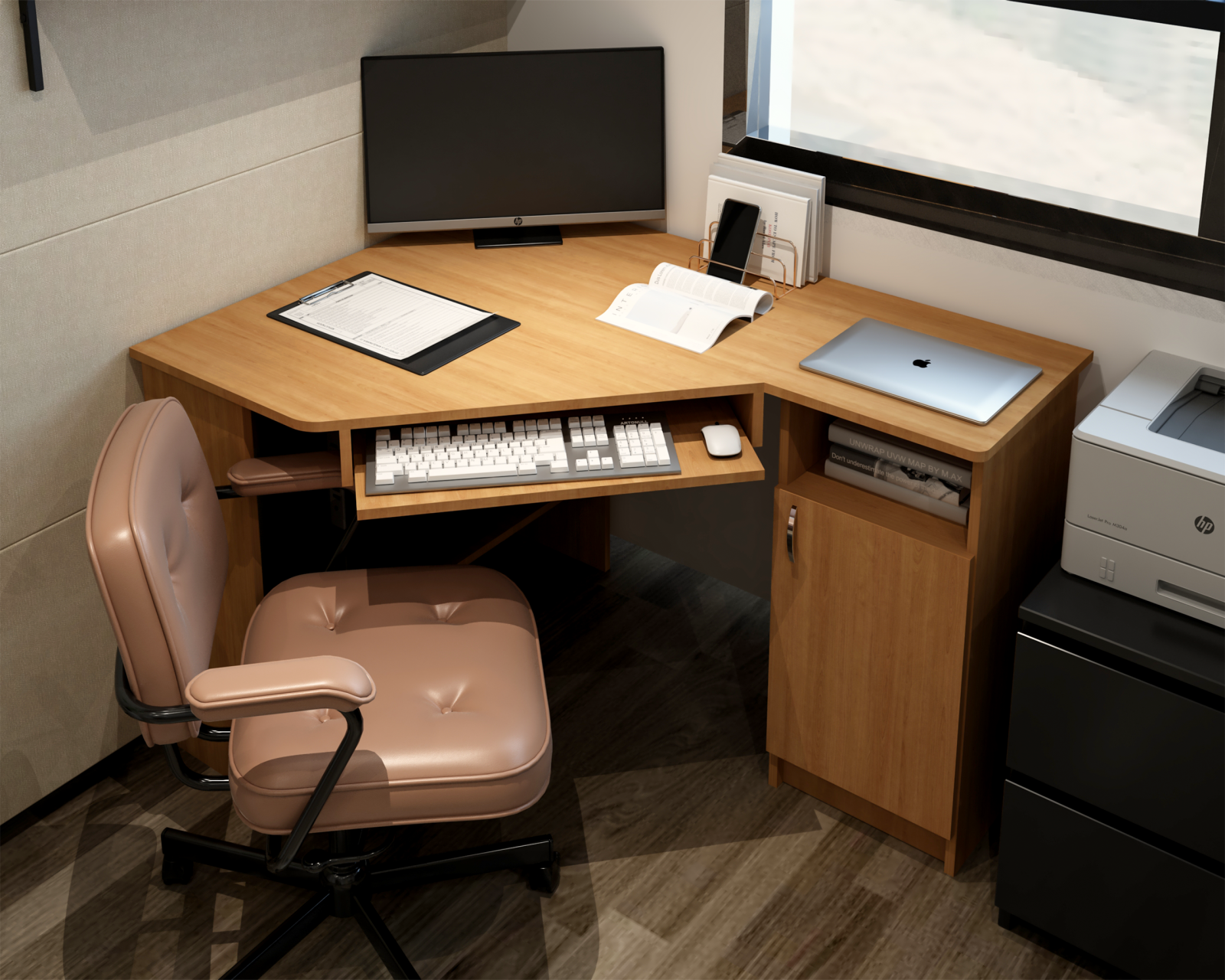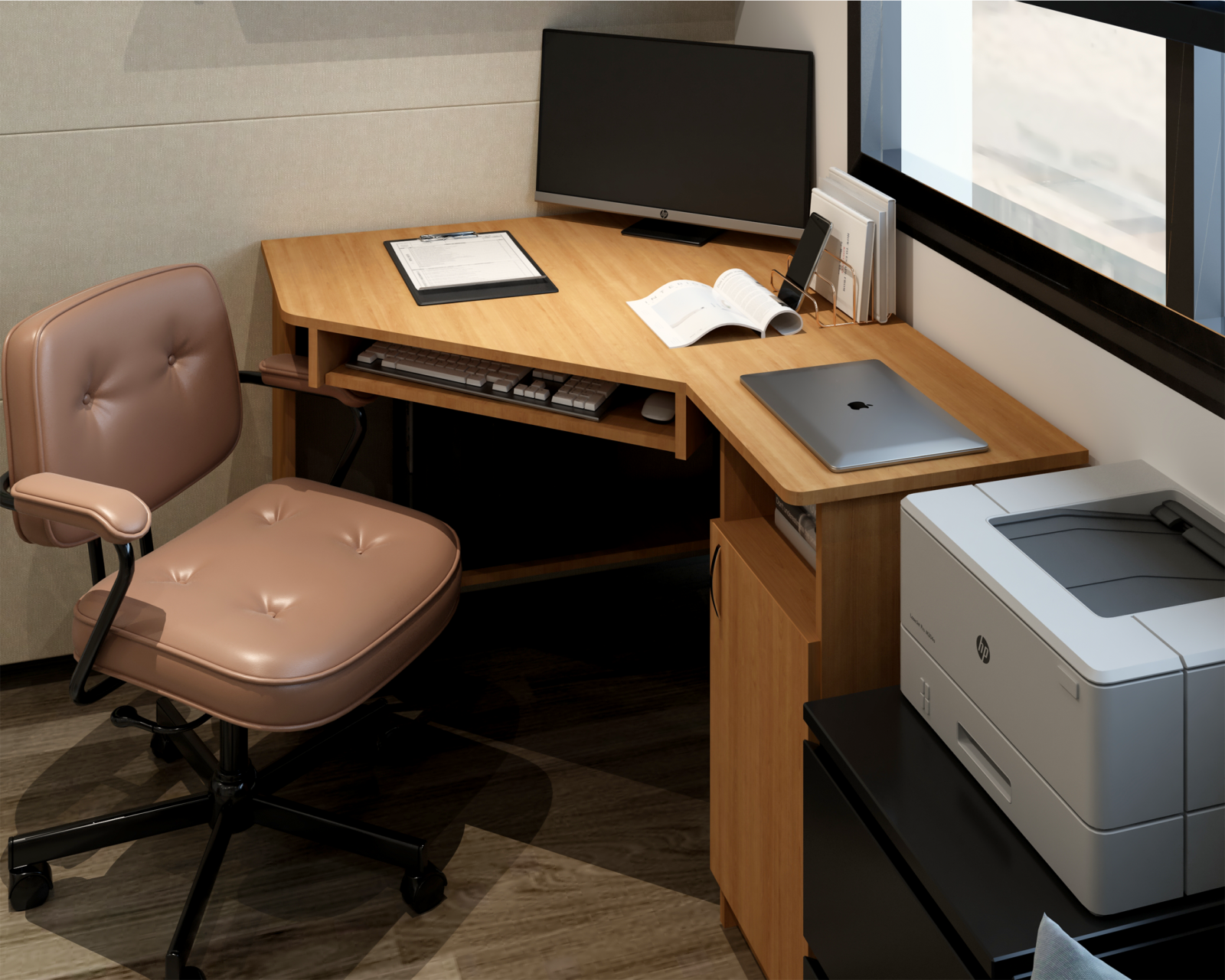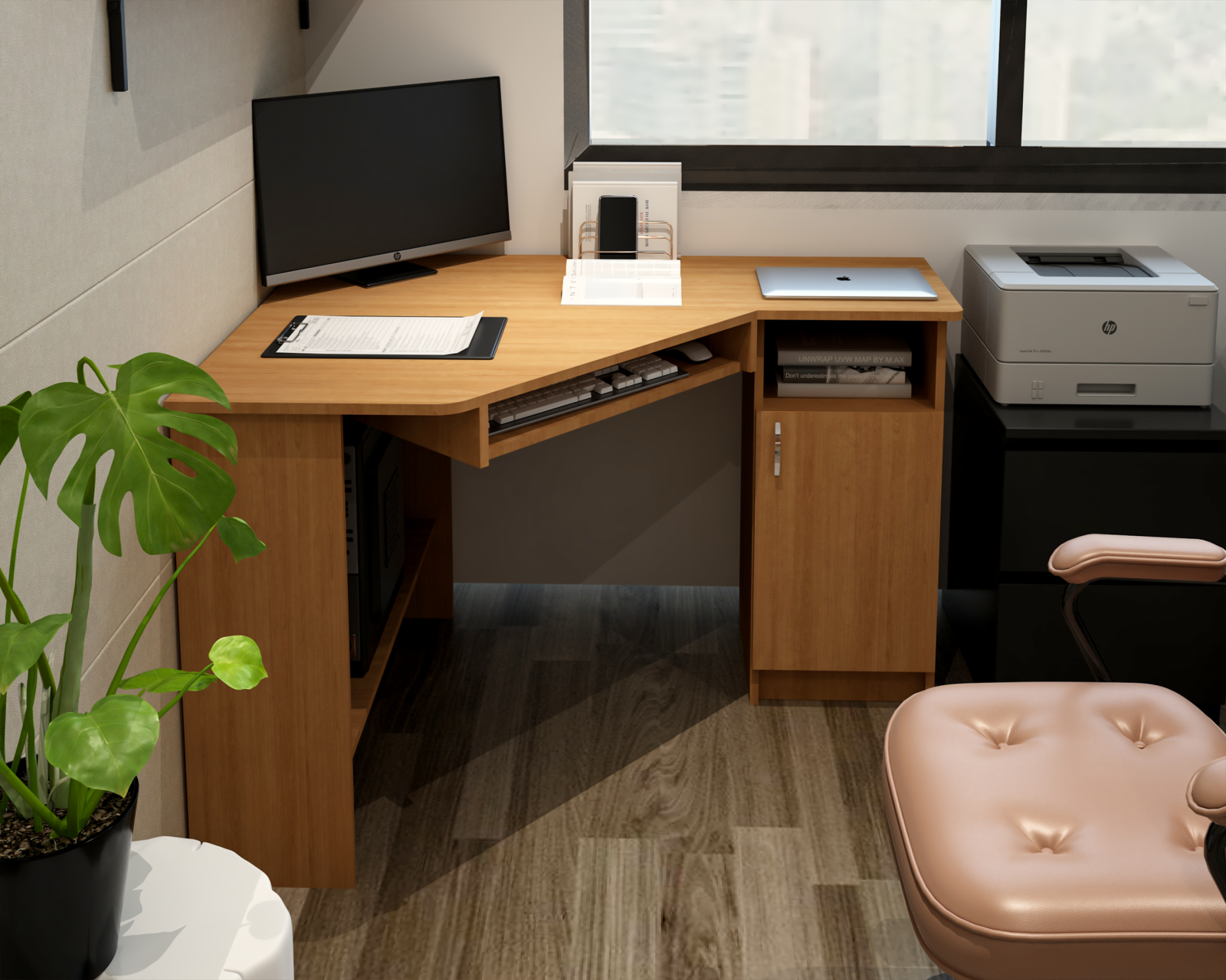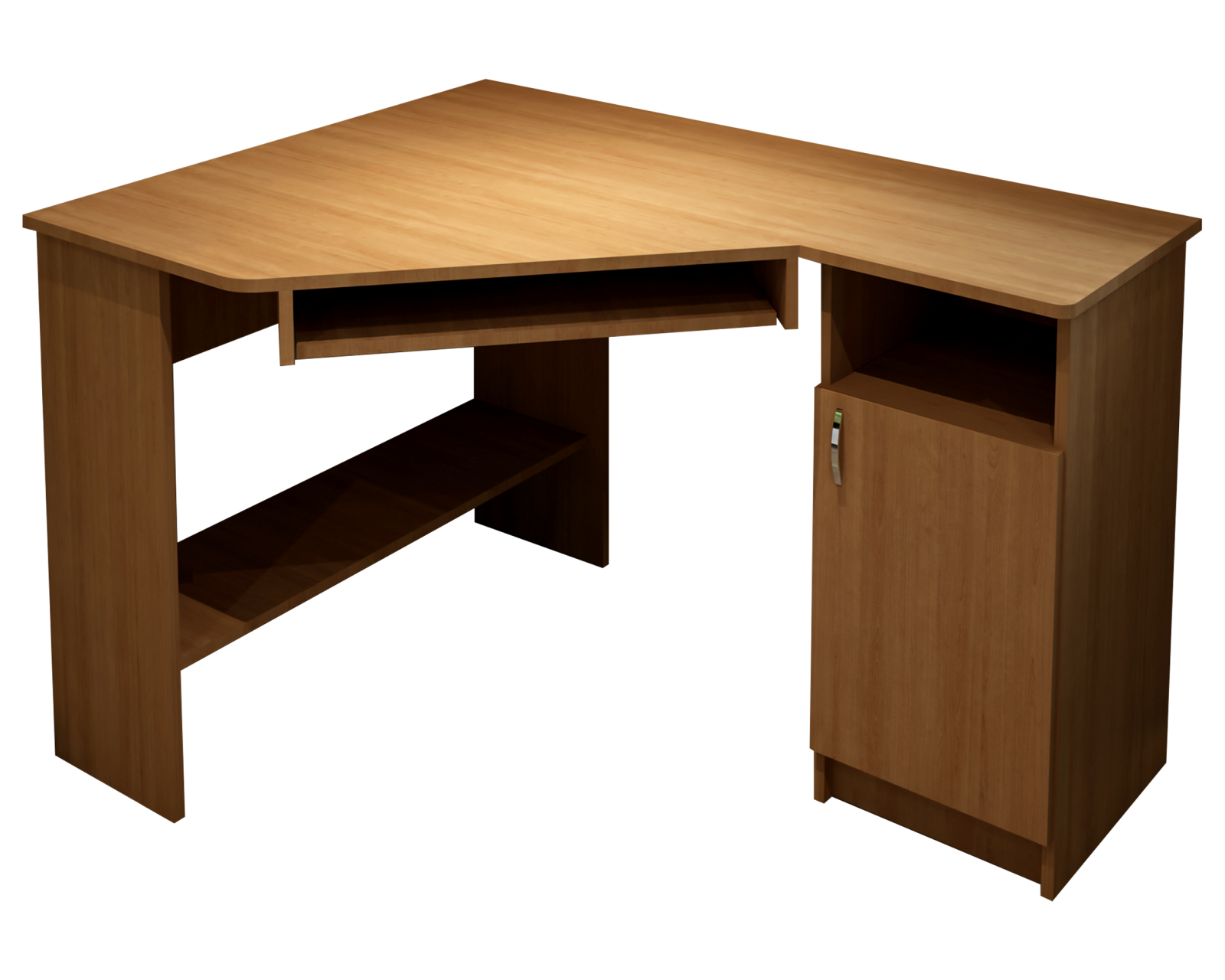 Biroul SU 1 este un birou pe colt, prevazut, pe latura din stanga (lungime =90cm), cu suport glisant pentru tastatura, raft suport pentru monitor, precum si un raft depozitare in partea inferioara. Latura din partea dreapta (lungime 120cm), este prevazuta cu 1 corp cu 3 rafturi si 1 usa.