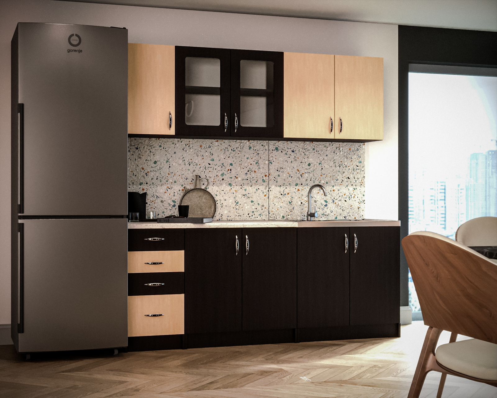 Bucataria este realizata din PAL Melaminat Wenge + Mesteacan cantuit cu ABS. Partea inferioara este formata dintr-o masca de chiuveta de 80cm, un corp de 80cm cu 2 usi, un corp de 40cm cu 4 sertare si o usa si blat termorezistent ( blat pentru fiecare corp in parte ), mai putin pentru corpul de masca. In partea superioara, bucataria este formata dintr-un corp de 80cm cu 2 usi, 1 corp vitrrina de 80cm cu 2 usi ( cu geam sablat ) si un corp de 40cm.