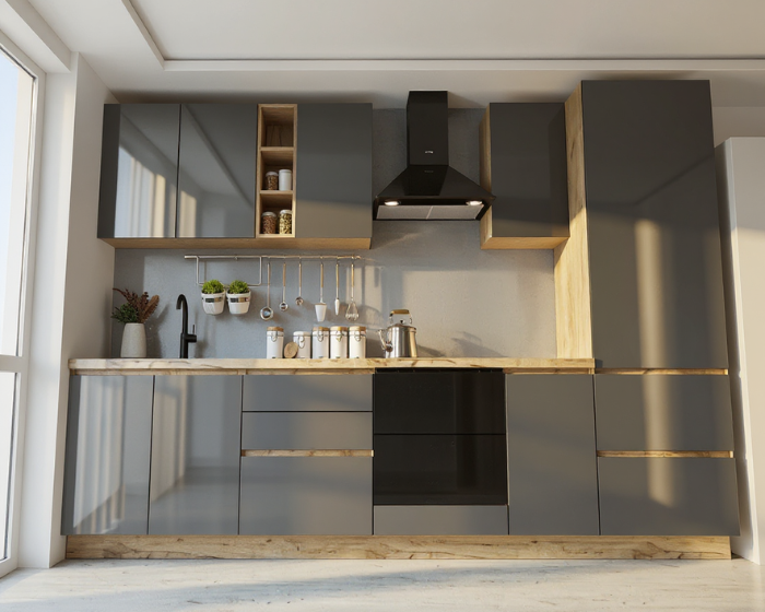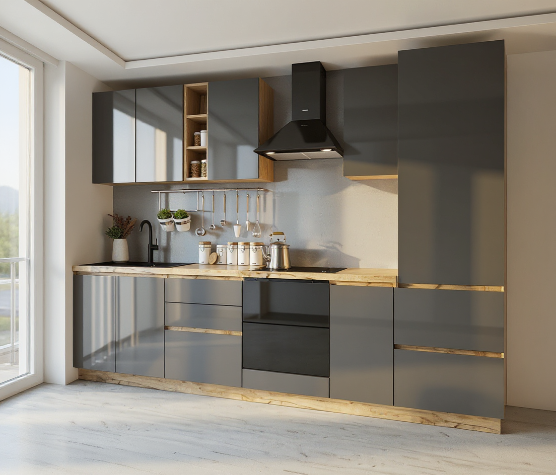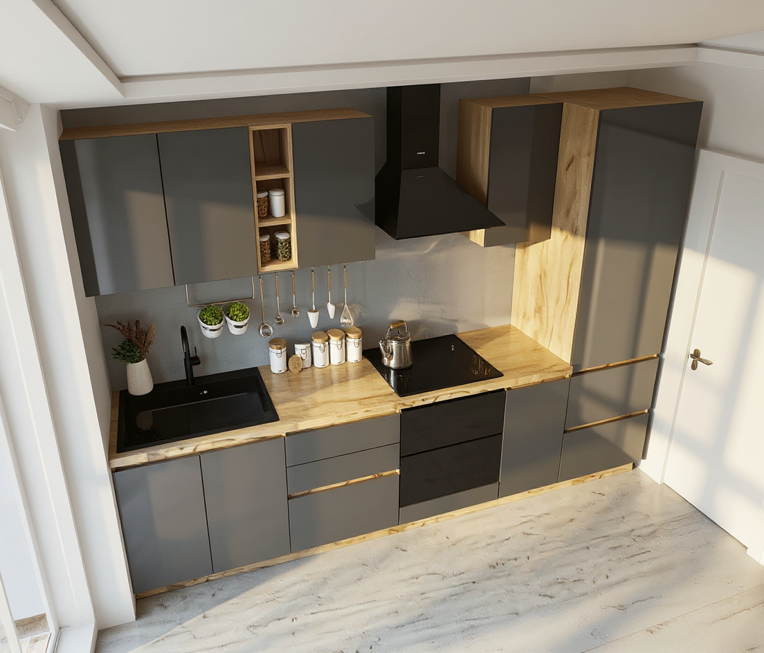 Set de mobilier pentru bucătărie, realizat din PAL melaminat Stejar K003 și fronturi MDF AGT antracit lucios, cu design contemporan și configurație premium. Bucătăria oferă spațiu generos de depozitare, funcționalitate ridicată și finisaje moderne, potrivite pentru bucătării mari.