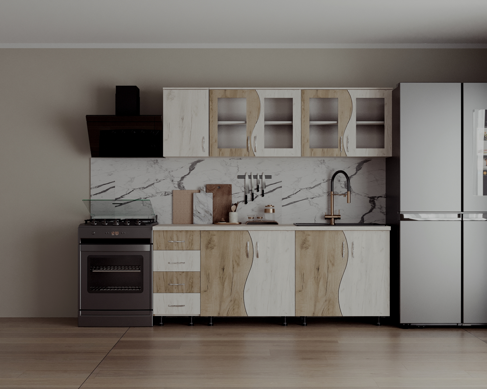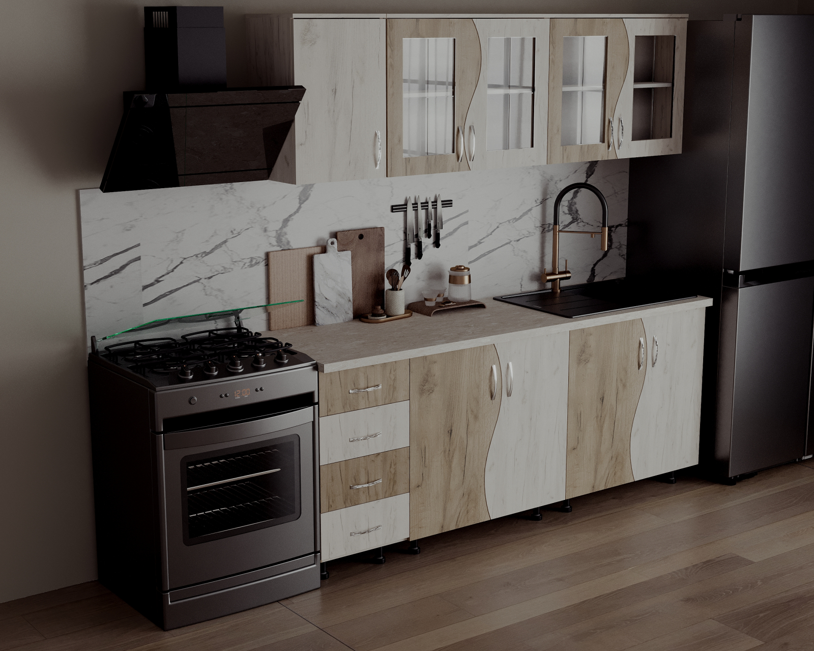 Set mobilă bucătărie realizat din PAL melaminat, cu design contemporan și configurație modulară, ușor adaptabilă spațiului disponibil.