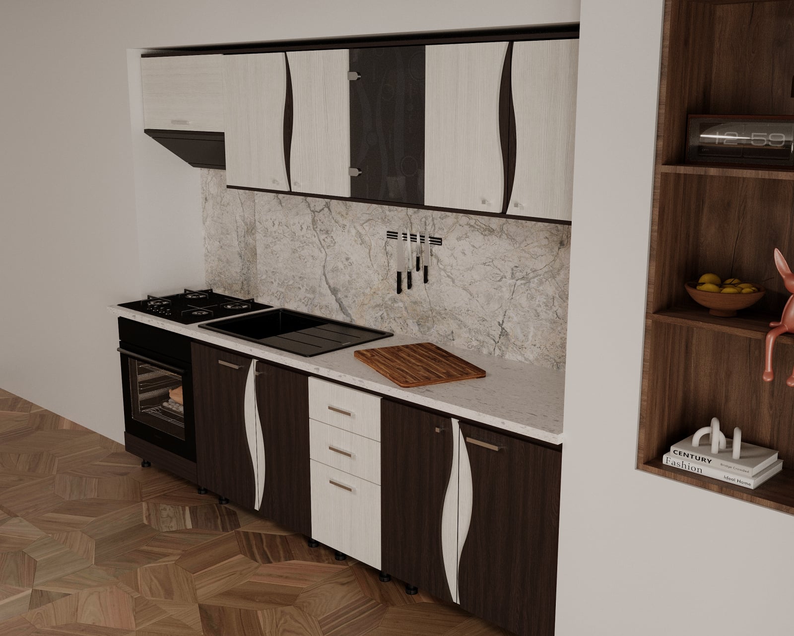 Bucataria este in 2 nuante ( PAL Wenge si PAL Alb ). Partea Inferioara este formata din 4 corpuri ( corp de 80cm cu 2 usi, corp de 40cm cu 2 sertare si o usa, masca de chiuveta de 80 si corp cuptor de 60cm ) iar partea superioara se compune din ( 2 corpuri de 80cm un corp de 40cm cu usa geam si corp de 60 ).