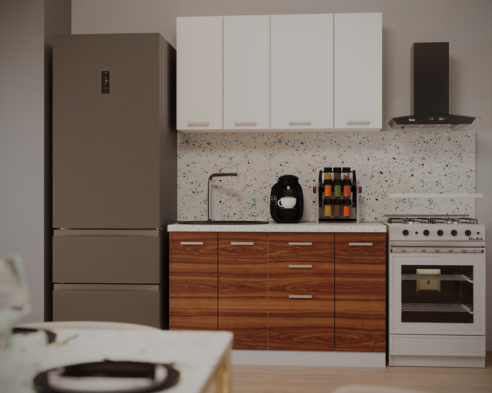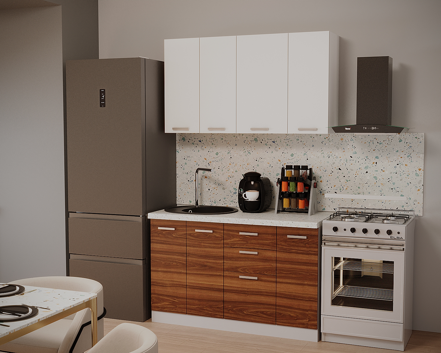 Set de mobilier pentru bucătărie, realizat din PAL melaminat, cu design modern și structură compactă, potrivit pentru bucătării de dimensiuni reduse. Configurația oferă spațiu de depozitare eficient și o organizare practică a zonei de gătit.