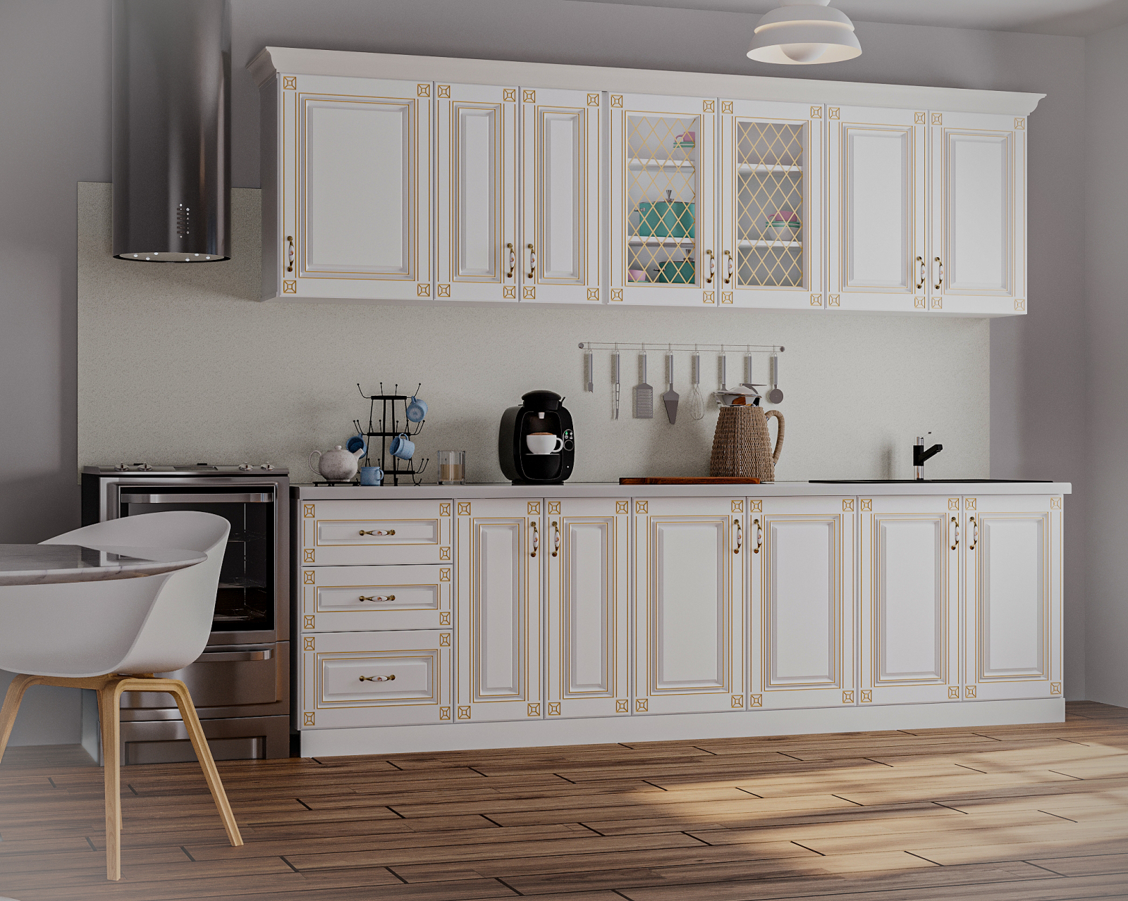 Set de mobilier pentru bucătărie, realizat din PAL melaminat și MDF infoliat, cu design modern și structură funcțională. Corpurile sunt concepute pentru a oferi spațiu generos de depozitare și o organizare eficientă a bucătăriei.
