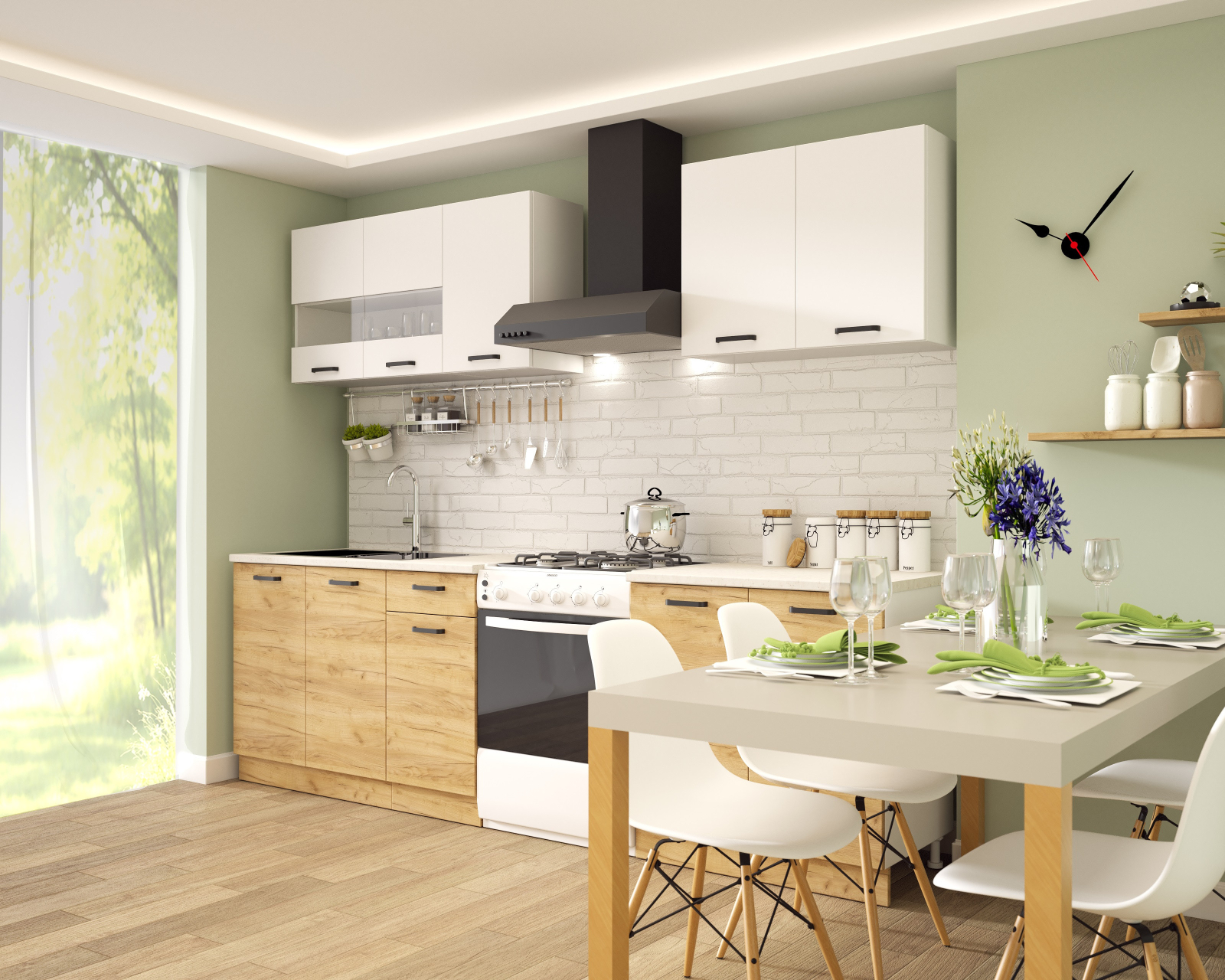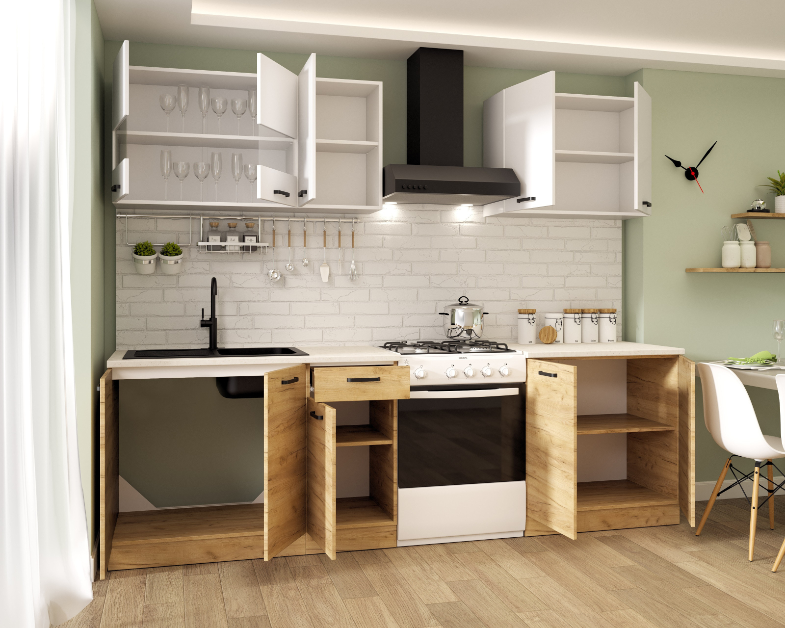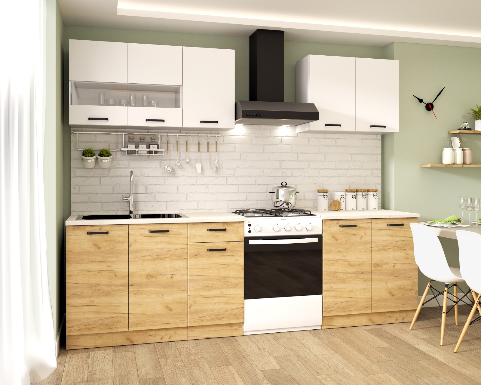 Set mobilier bucatarie modern, configuratie practica, potrivita pentru spatii medii.