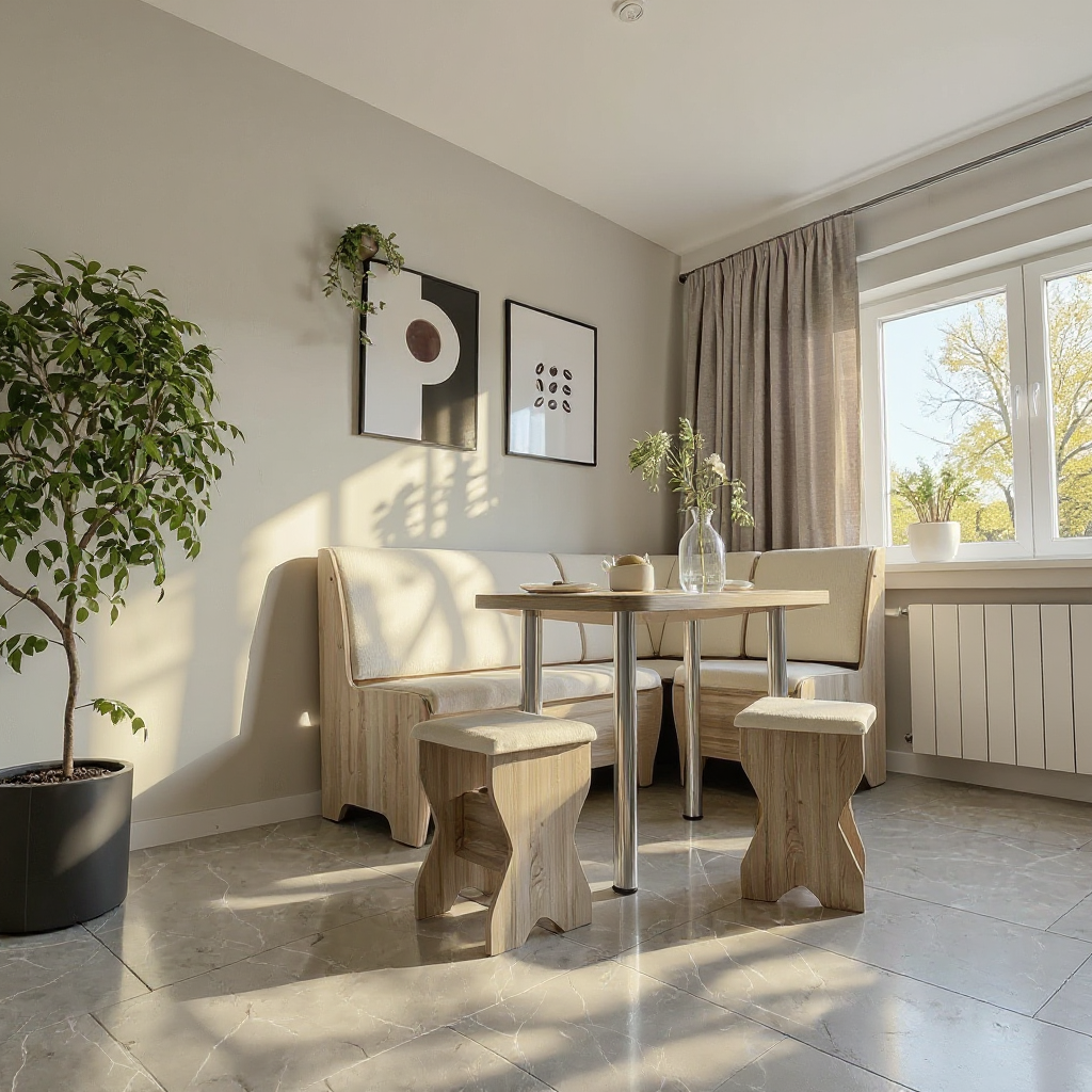 Set colțar bucătărie Tunis, cu masă și 2 tabureți, soluție practică și funcțională pentru zona de bucătărie. Setul oferă confort, spații de depozitare sub șezut și montaj reversibil, adaptabil în funcție de spațiul disponibil.