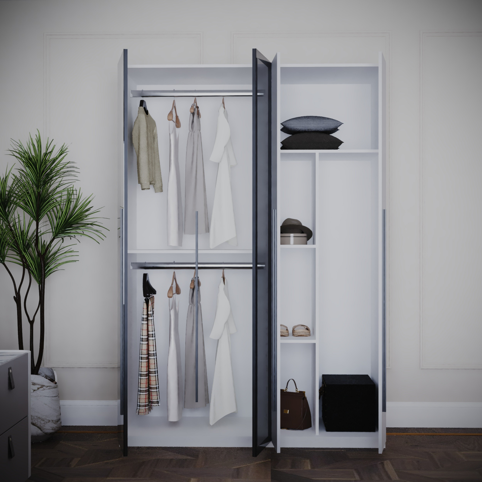 Acest dulap elegant, finisat într-un alb mat , se remarcă prin designul său modern. Dulapul dispune de patru uși: două dintre ele sunt culoarea alb , asigurând o notă de simplitate și eleganță, în timp ce celelalte două sunt din sticlă fumurie, oferind un aspect aerisit și permițând vizualizarea conținutului. Manerele de culoare neagra adaugă un accent minimalist completând aspectul piesei.