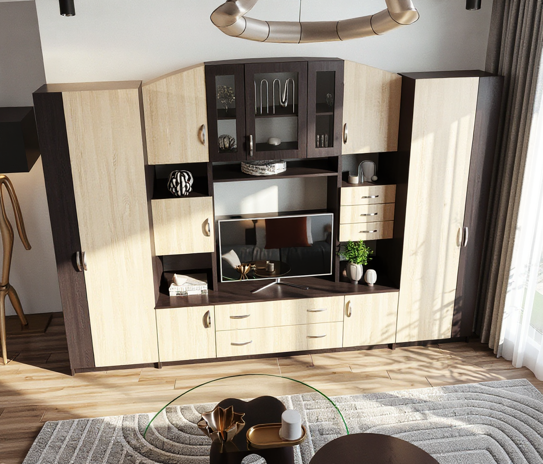 Set de mobilier pentru living, cu structură completă și compartimentare practică, realizat din PAL melaminat, potrivit pentru amenajarea unui spațiu modern, bine organizat și funcțional.