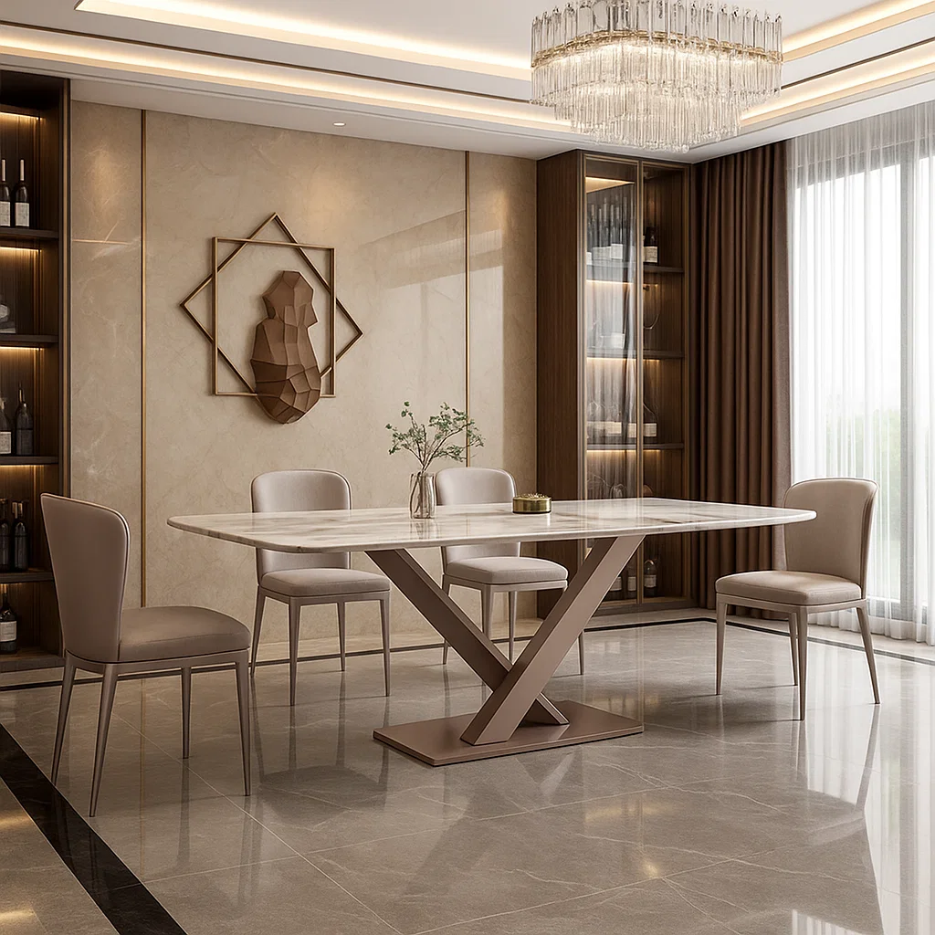 Picioarele în culorile calde ale rose gold-ului nu doar că adaugă un contrast sofisticat cu albul pur al marmurei, dar și conferă întregii structuri o stabilitate robustă, garantând durabilitatea și rezistența pe termen lung. Designul modern, cu linii curate și aspect elegant, face din această masă o alegere perfectă pentru cei care doresc să adauge o notă de lux și rafinament în decorul lor interior.
