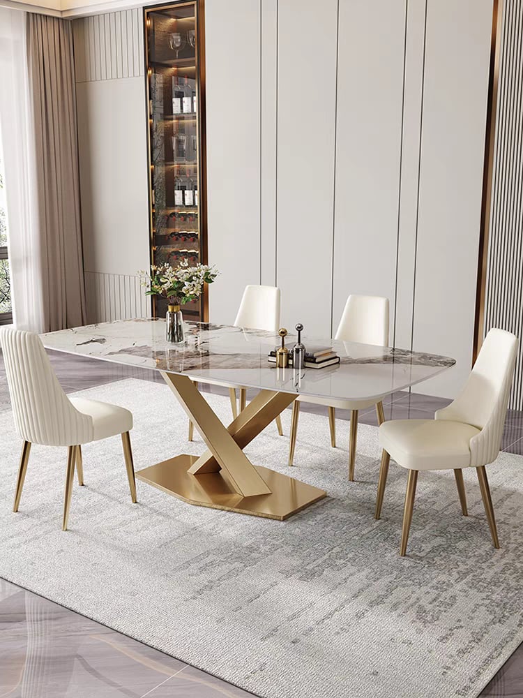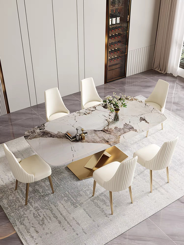 Aceasta masa de dining combina luxul marmurei cu stralucirea piciorului de culoare aurie. Blatul din marmură, cu dimensiunile de 1800*900*750, oferă o suprafață spațioasă și durabilă, perfectă pentru mesele festive sau întâlnirile cu familia.Aceasta masa este ideala pentru orice sufragerie moderna,fiind o piesa ce aduce un plus de stil si eleganta oricarei sufragerii.