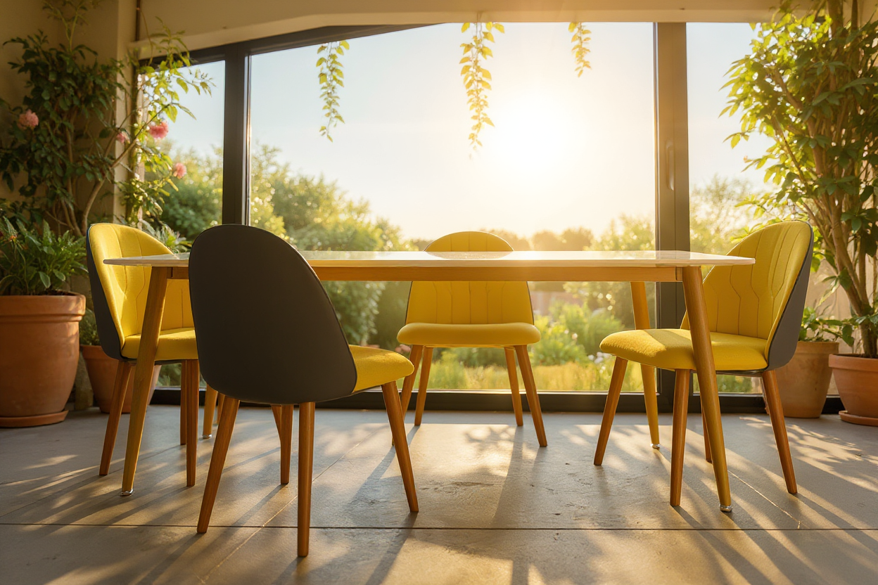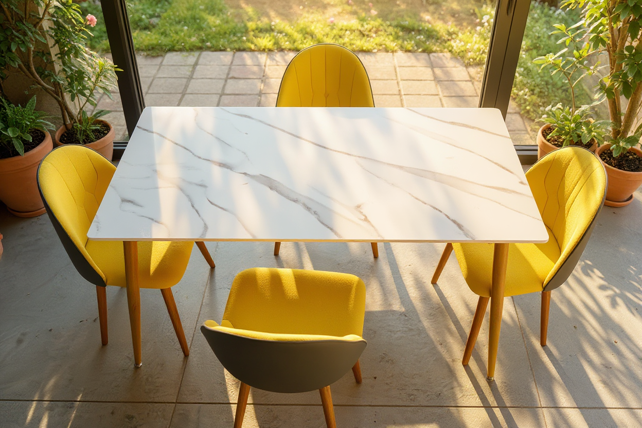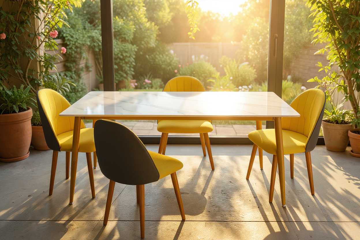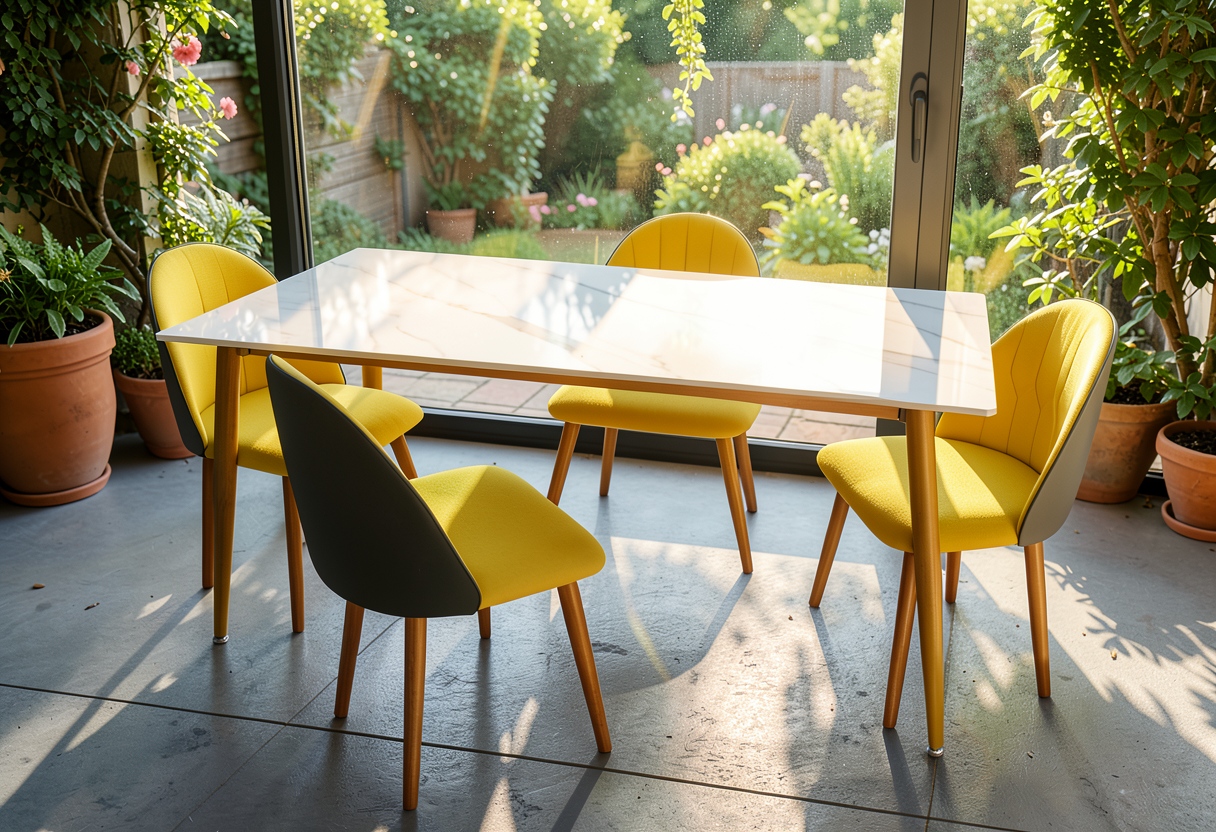Set mobilier pentru bucătărie sau living, cu design modern și structură rezistentă, compus din masă și 4 scaune. Combinația de materiale și finisaje oferă un aspect contemporan și funcționalitate practică. Poze reale.