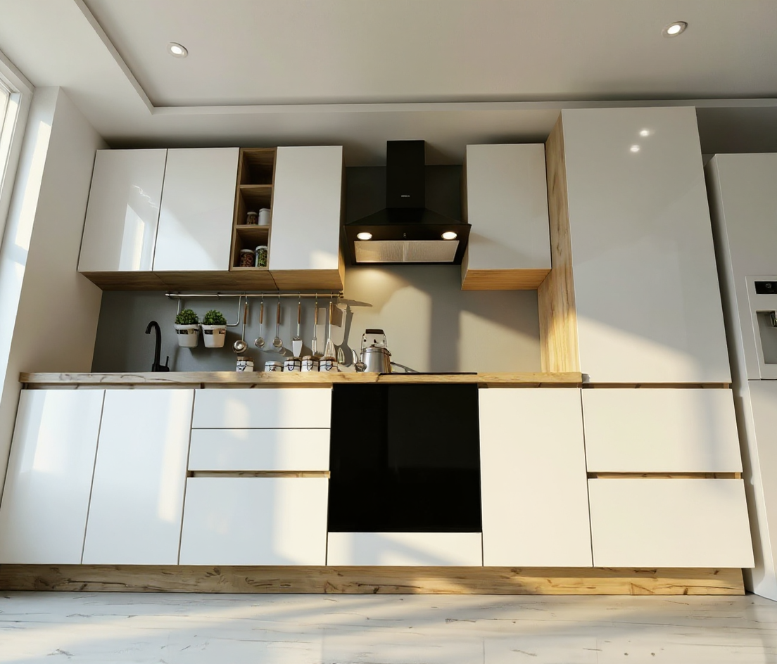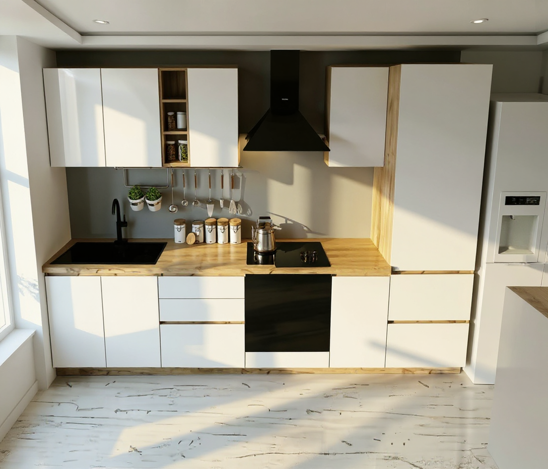 Set de mobilier pentru bucătărie, realizat din PAL melaminat Stejar K003 și fronturi MDF AGT alb lucios, cu design contemporan și configurație premium. Bucătăria oferă spațiu generos de depozitare, funcționalitate ridicată și finisaje moderne, fiind potrivită pentru bucătării mari.