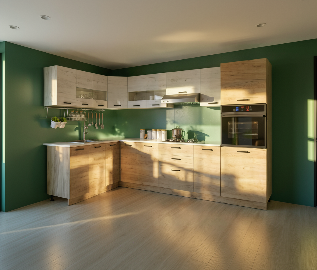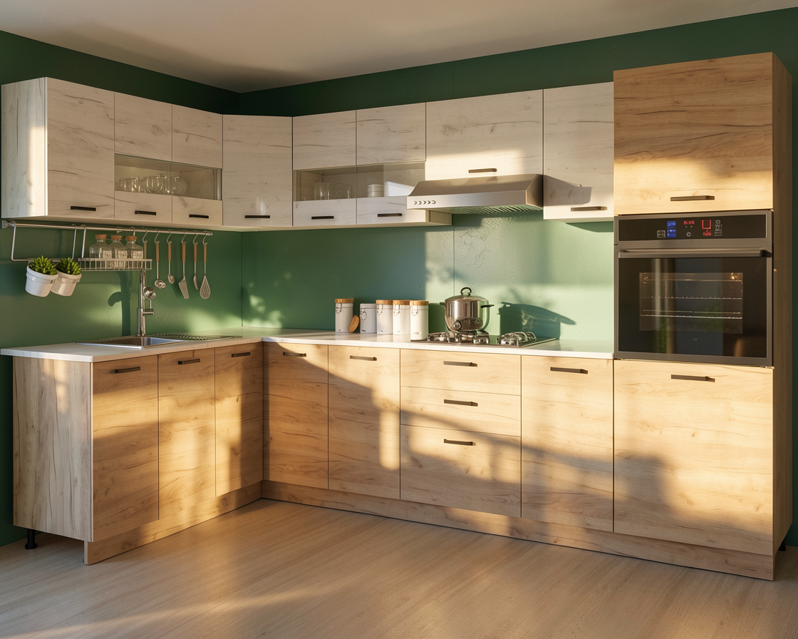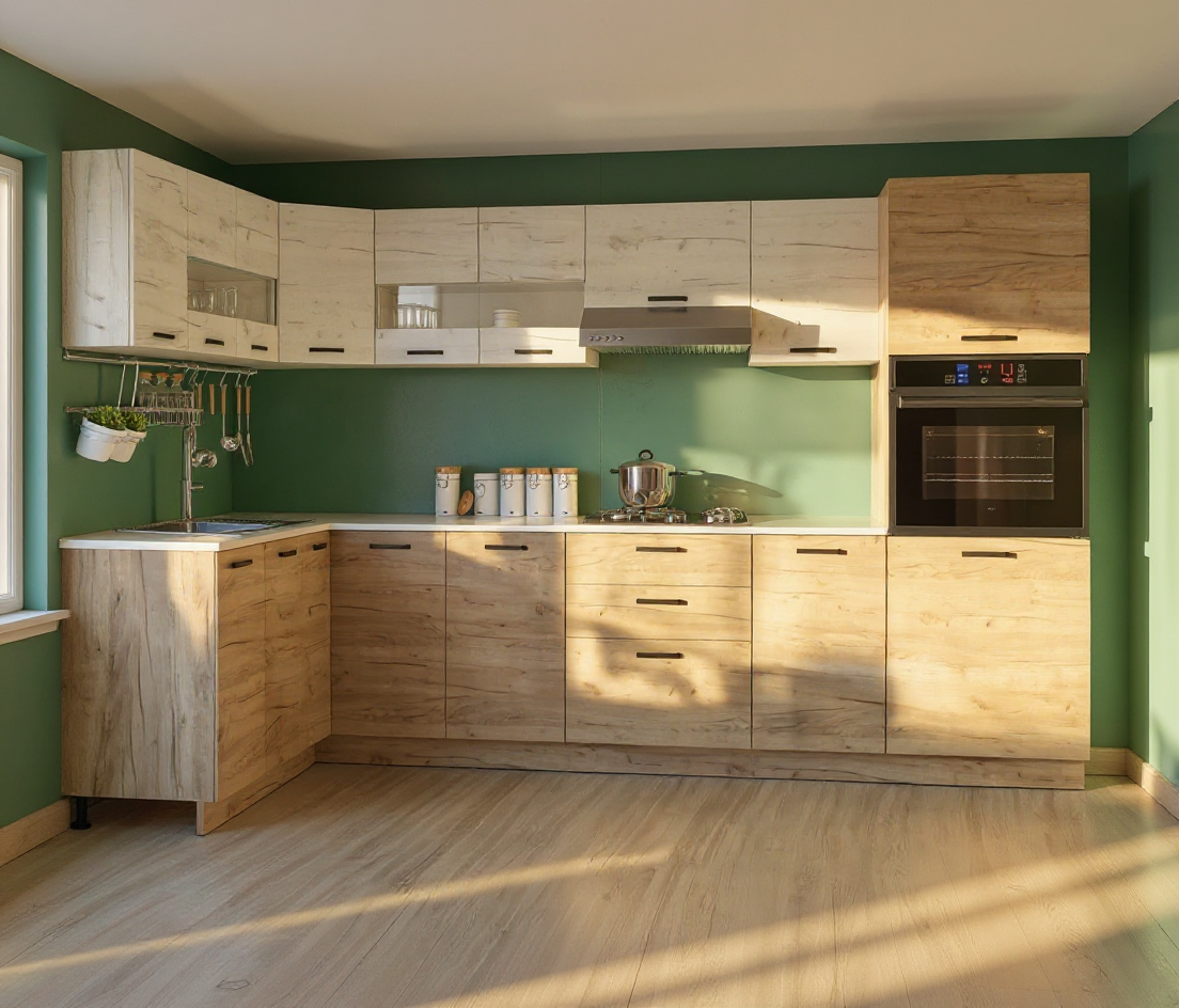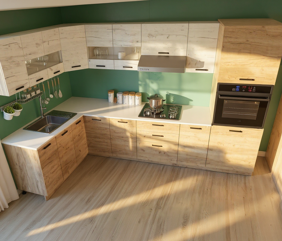 Set de mobilier pentru bucătărie, realizat din PAL melaminat, cu design clasic și structură funcțională. Configurația pe colț este concepută pentru a asigura spațiu generos de depozitare și o organizare eficientă a bucătăriei.