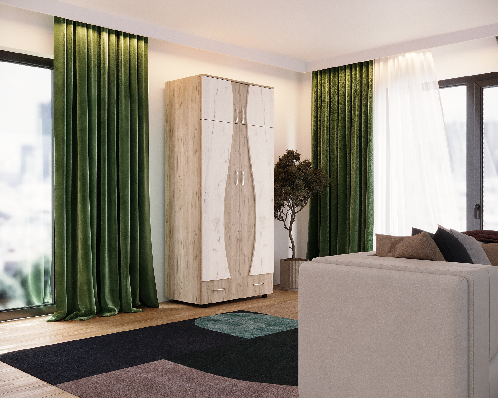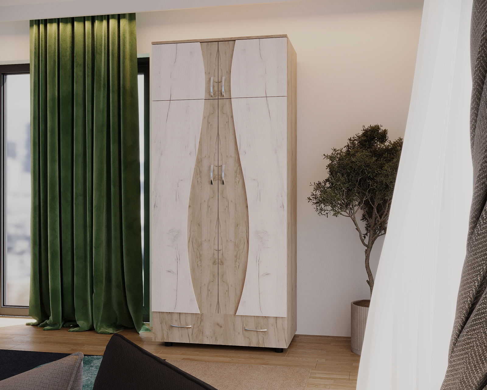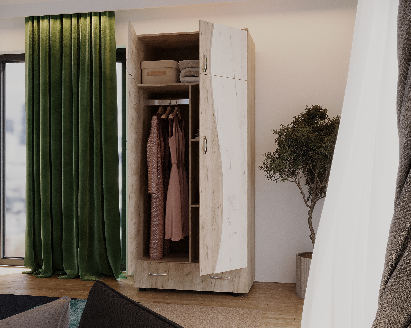 Dulap cu design contemporan, realizat din PAL melaminat în nuanțe K002+K001, cu compartimentare practică. Este format din două corpuri (dulap și suprapozabil), oferind spațiu eficient pentru depozitare haine și accesorii.