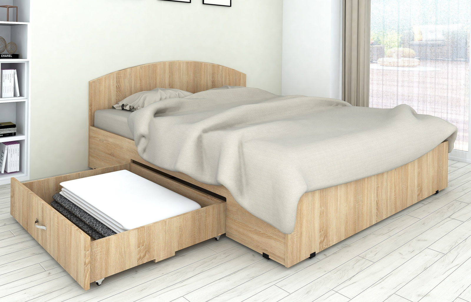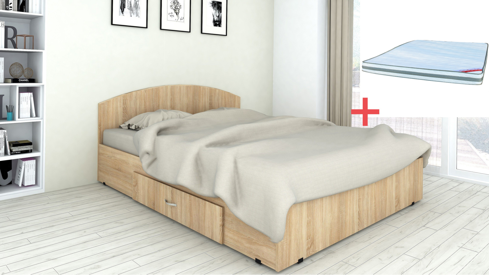 Set pat mijloc cu saltea pentru dormitor, cu design modern și structură practică, prevăzut cu sertar pentru depozitare și saltea din spumă, potrivit pentru utilizare zilnică.