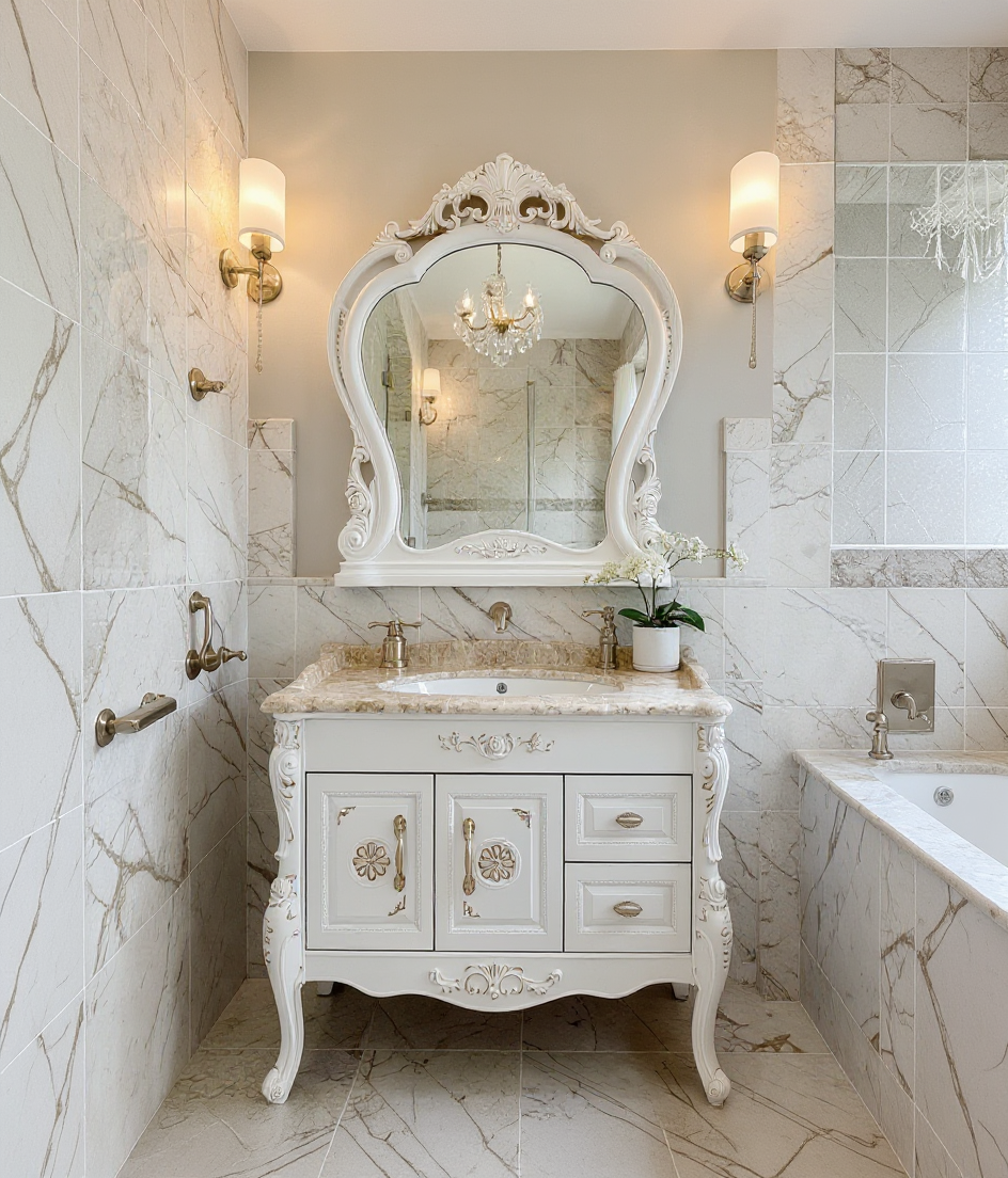 Set mobilier pentru baie 773, cu design elegant și finisaje moderne Alb/Aur, conceput pentru a oferi un echilibru între estetică și funcționalitate. Setul include mască cu lavoar și oglindă, fiind ideal pentru organizarea eficientă a spațiului din baie.