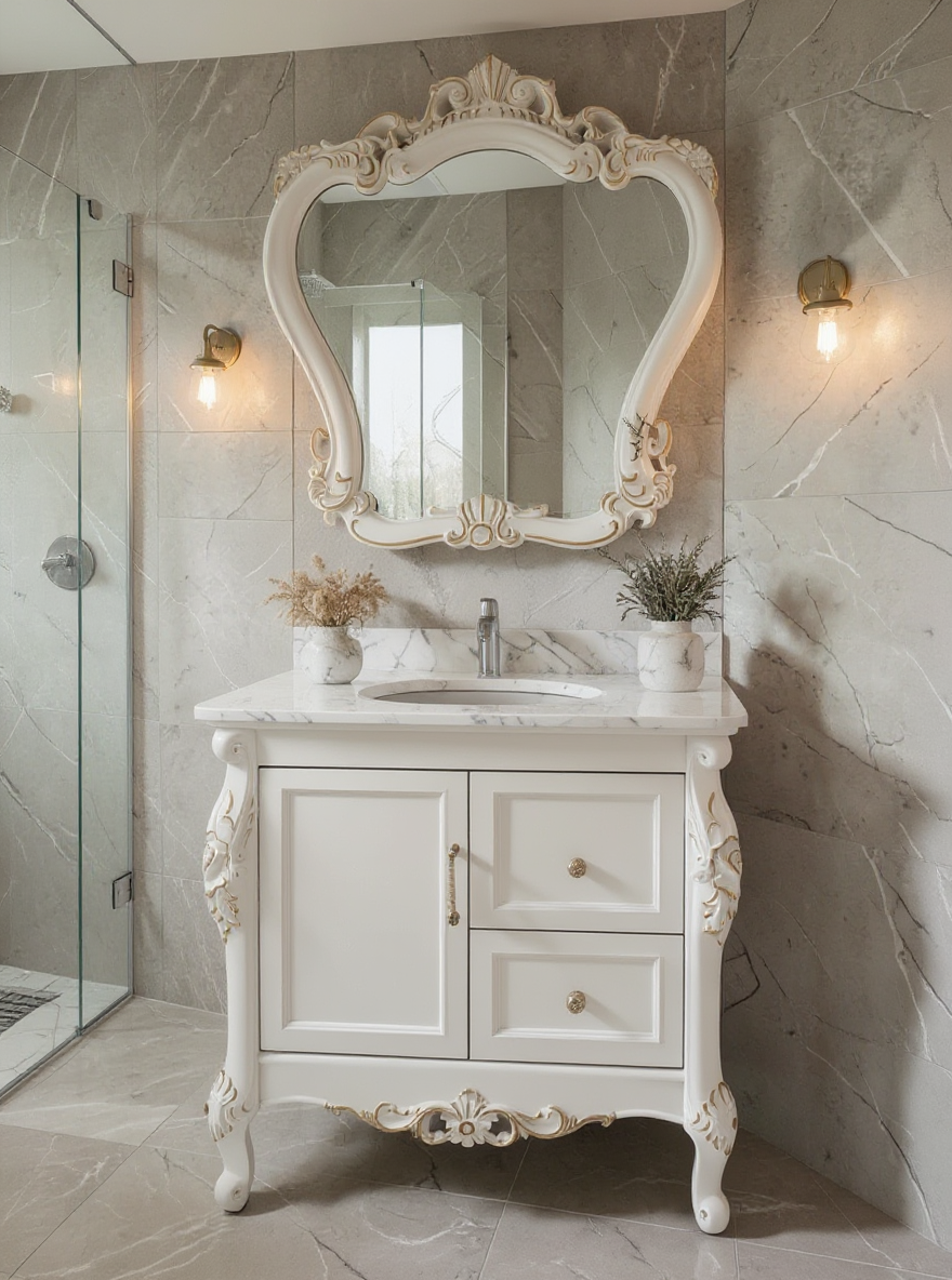 Set mobilier pentru baie 772, realizat din PVC cu finisaj Alb/Aur, cu design modern și compartimentare practică. Include mască cu lavoar și oglindă, ideal pentru organizarea eficientă a spațiului din baie.