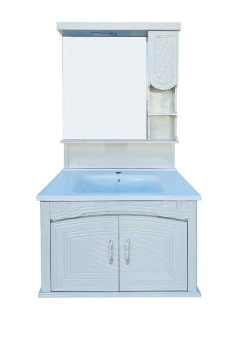 Set mobilier baie realizat din PVC Crem deschis, cu design elegant și funcțional, potrivit pentru băi moderne.
